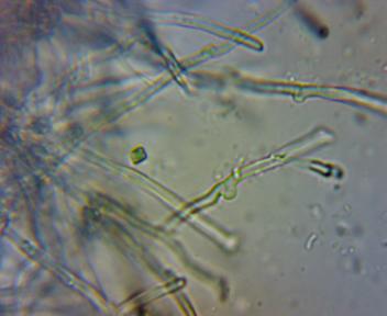 ลักษณะโคโลนีของเชื้อบนอาหาร PDA เส้นใยหยาบสีขาว บริเวณผนังกั้น แต่ละเซลล์ ของเส้นใยของเชื้อมี clamp connection เชื้อราสร้างเม็ดสเคลอโรเทียสีขาว และเปลี่ยนเป็นสีตาลอ่อนและ น้ำตาลเข้มเมื่อแก่